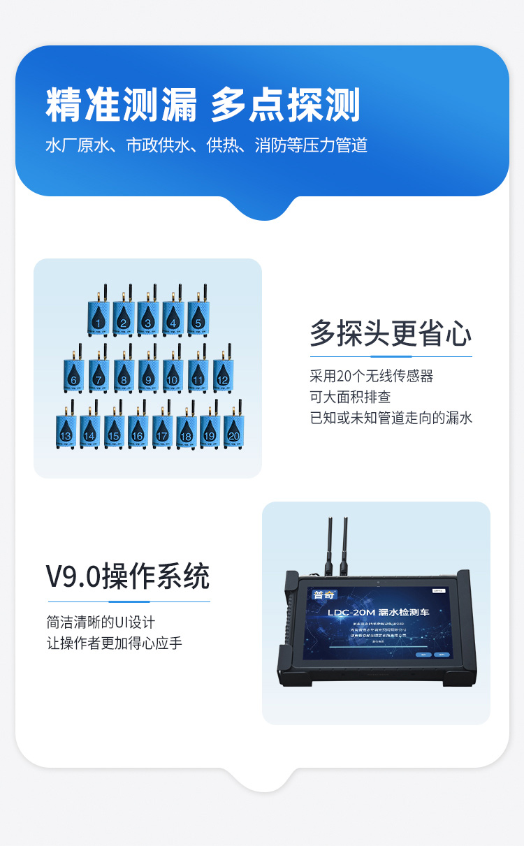 该设备综合以上三种检测功能于一体,可结合使用,也可单独使用其中的某一项功能,大大提高了 工作效率和准确度,从而解决因各种情况和原因造成漏水的问题。