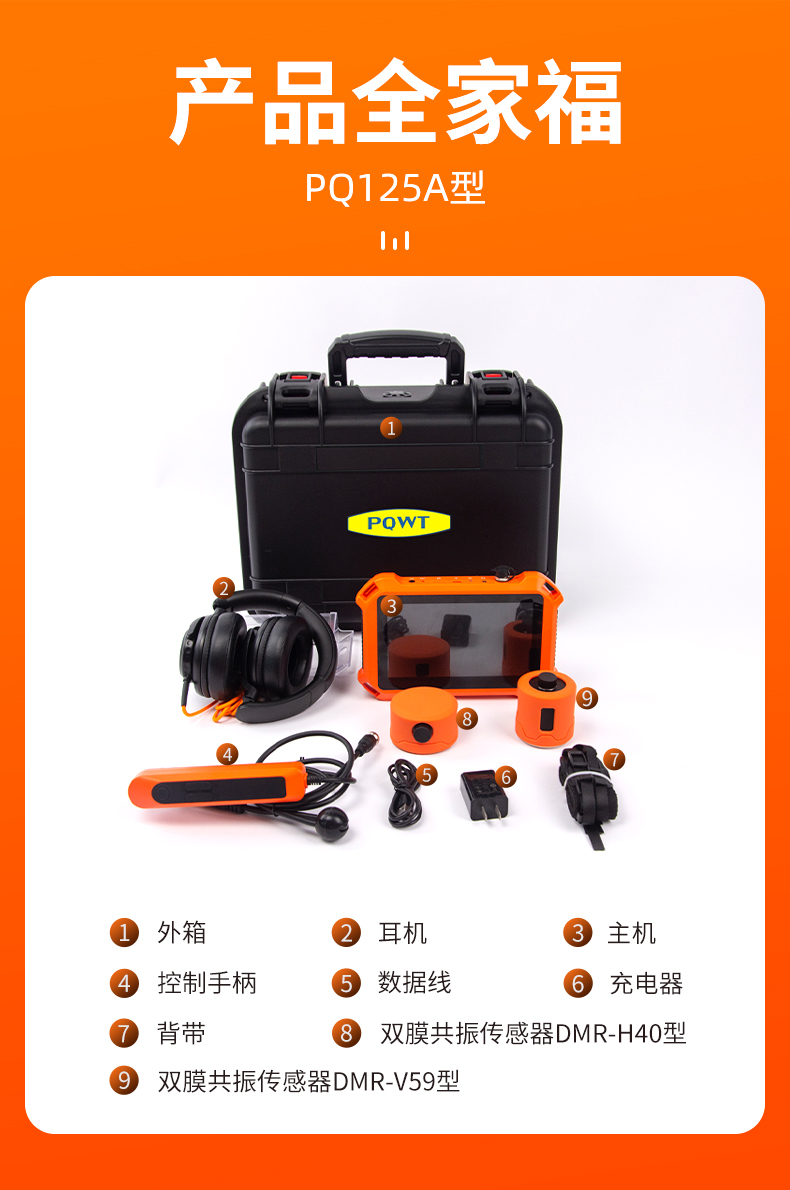 普奇PQ125A系列管道漏⽔检测仪是由我院⾃主研发的新⼀代智能检测仪器,专为室内压力管道泄漏检测场景而设计。配备两款传感器,包括双膜共振传感器DMR-V59和DMR-H40;其中DMR-V59适用于常规室内地面检测,方便手提操作及移动。DMR-H40适用于室内狭窄空间检测,比如物体空间缝隙,墙面,其接触面积更多,精准度更高。可灵活适应室内主支线的检测需求。